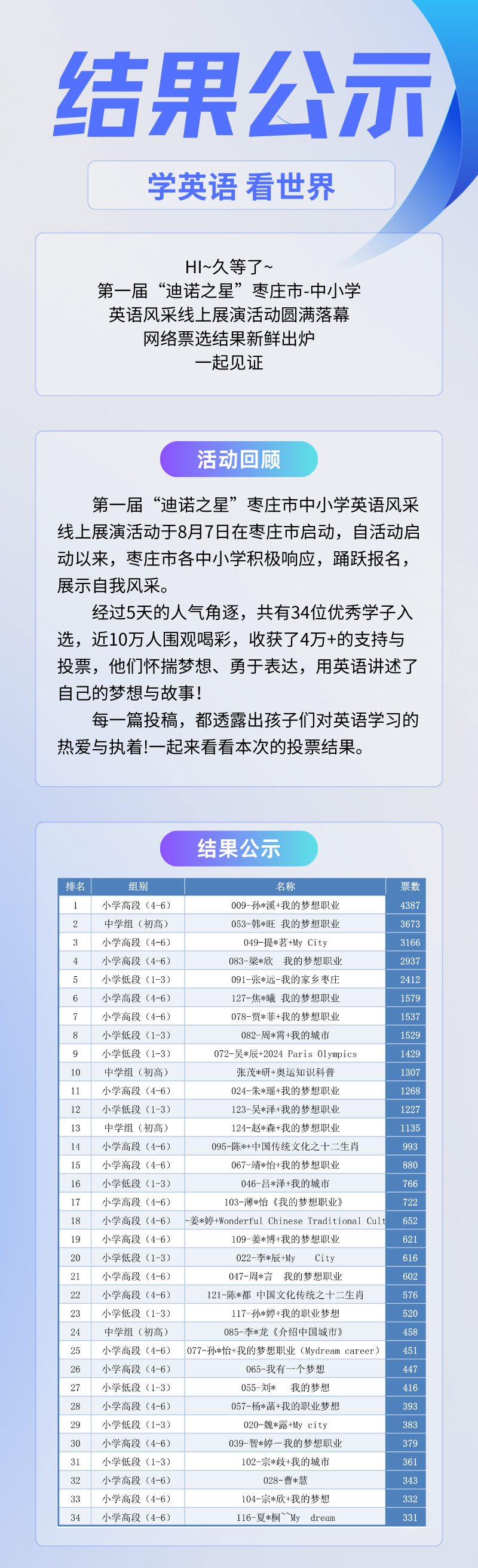 【结果公布】第一届“迪诺之星”枣庄市中小学英语风采线上展演圆满落幕