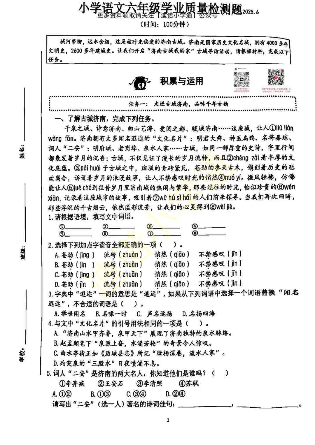 【可直接下载打印】2025历下区六年级下学期语文抽测试卷