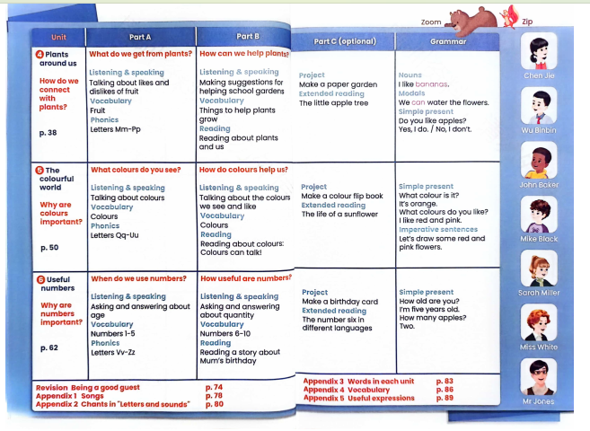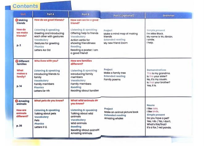每个主题单元均精心构建为四个核心部分,它们分别是:Part A、Part B、Part C 以及 Grammar 环节。这样的结构设计旨在为学生打造一个全方位、多维度的英语学习体验。