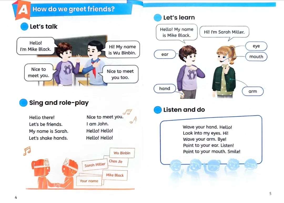 ④最后,“Listen and Do”听一听做动作环节,采用了广受欢迎的TPR(全身反应教学法)。这种方法通过指令与动作的紧密结合,使学生在听、做互动中自然而然地掌握语言,尤其适合英语启蒙和初期学习阶段的学生。新教材在这一环节的强化,无疑为学生提供了更多实践机会,促进了其语言技能的全面发展。