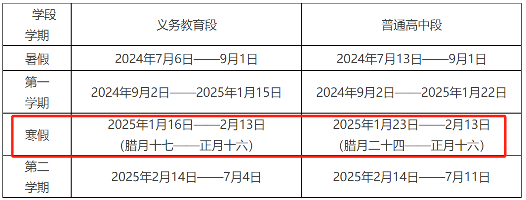 普通高中学校:寒假自2025年1月23日开始,至2月12日结束,共计21天。