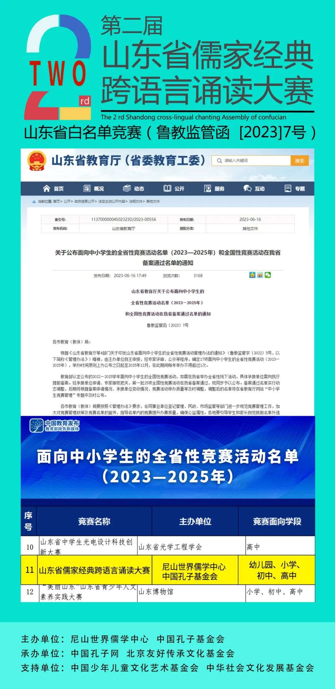根据《山东省教育厅关于公布面向中小学生的全省性竞赛活动名单(2023-2025年)和全国性竞赛活动在山东省备案通过名单的通知》(鲁教监管函〔2023〕7号)要求,尼山世界儒学中心、中国孔子基金会举办第二届山东省儒家经典跨语言诵读大赛,并制定如下方案。
