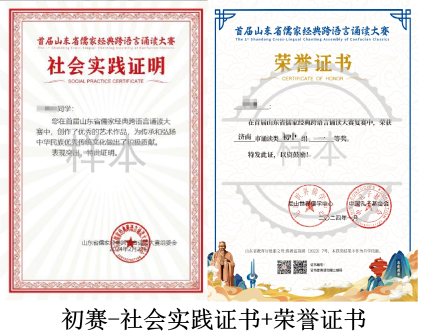 证书为综评、评优加持:可获得社会实践证书+获奖证书,为中小学综合素质评价、在校评优评先丰富简历;决赛证书由7大部门联合盖章(尼山世界儒学中心、中国孔子基金会、山东省教育厅、山东省人民对外友好协会、中国一上海合作组织地方经贸合作示范区管理委员会、外语教学与研究出版社、中国翻译协会)