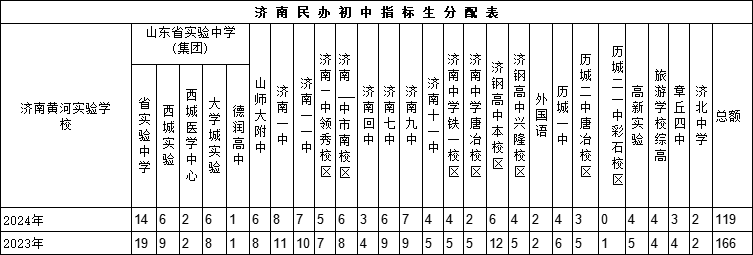 济南黄河双语学校拥有119个指标生名额,相对于2023年较少了47人。