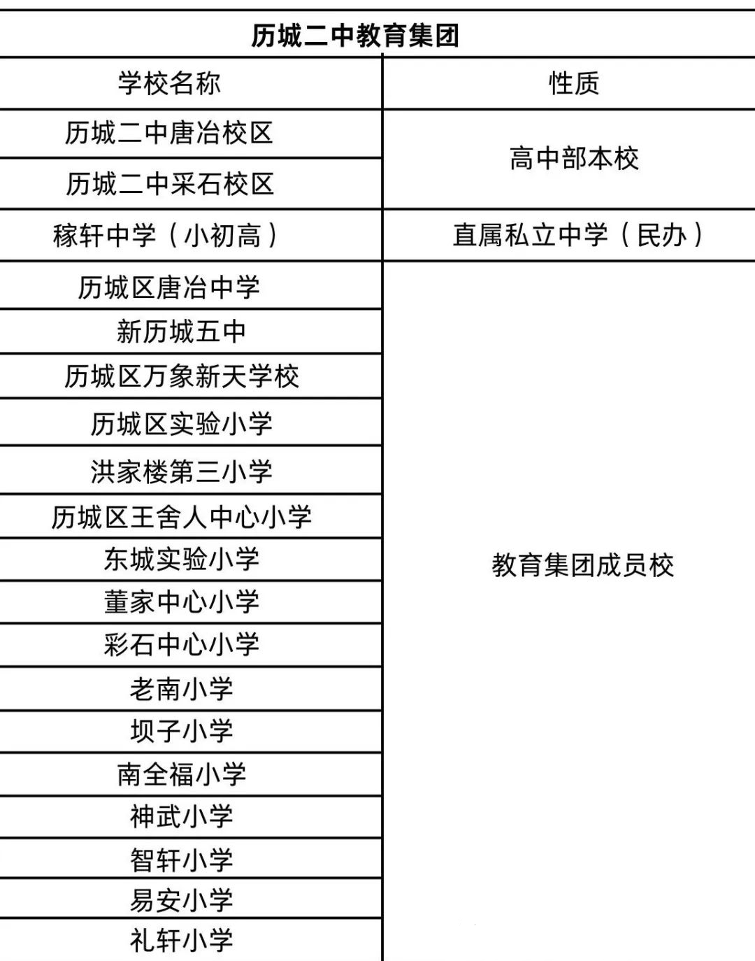 历城二中教育集团于2015年正式成立,业务全面覆盖小学、初中、高中三个教育阶段。集团旗下的核心校区包括历城二中唐冶校区、彩石校区,济南稼轩学校同样是集团重要成员。此外,万象新天学校、智轩学校等通过签约加入,也成为集团发展的重要力量。